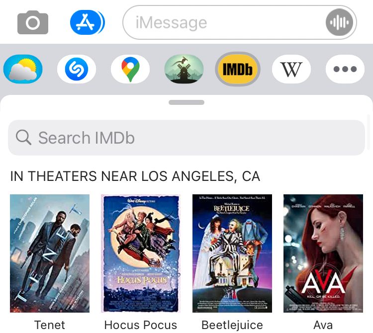 Bạn đang lên kế hoạch xem phim cùng bạn bè? Chọn ngay IMDb và ứng dụng mở rộng trên iMessage, bạn sẽ được cung cấp một danh sách gồm những bộ phim đang chiếu nơi bạn sống (miễn là bạn cho phép ứng dụng truy cập dữ liệu vị trí) và tìm kiếm dựa trên cơ sở dữ liệu của IMDb ngay trên ứng dụng nhắn tin của thiết bị.