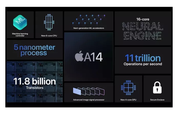 Apple thường có thói quen ra mắt bộ vi xử lý hàng đầu của mình cùng với iPhone thế hệ mới. Tuy nhiên năm nay, lần đầu tiên chúng ta nhận được con chip A14 Bionic mới nhất trên chiếc iPad Air 4 2020. Con chip này bao gồm 11.8 tỷ bóng bán dẫn đáng kinh ngạc (sử dụng quy trình 5nm) và có thể tăng hiệu suất lên đến 40% so với con chip A12 trước đó của iPad Air 3. Đồng thời, nó cũng có kiến trúc đồ họa 4 lõi mới để tăng được 30% hiệu suất đồ họa và hoạt động một cách cực kỳ tiết kiệm pin.